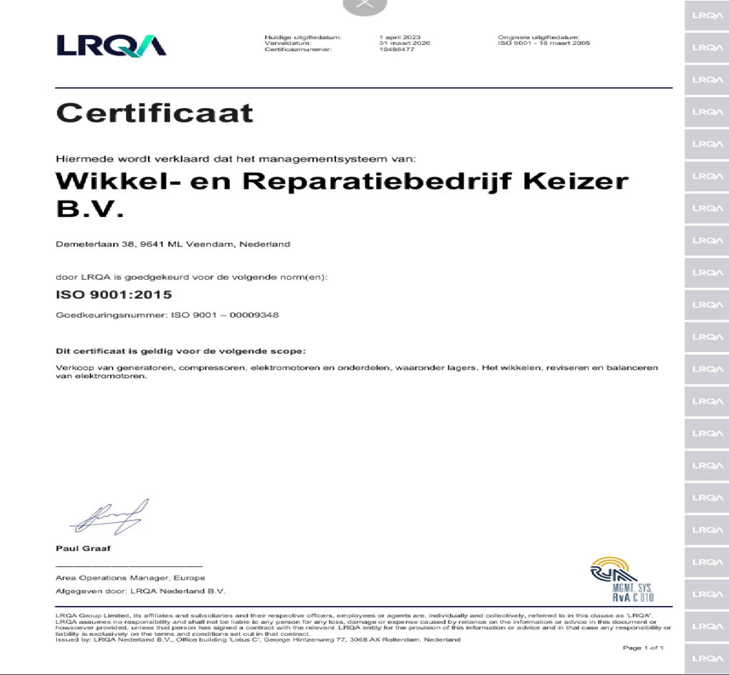 Bij Wikkelbedrijf Keizer in Veendam staan kwaliteit, veiligheid en vakmanschap centraal. Sinds 2005 zijn wij gecertificeerd volgens NEN-EN-ISO 9001 en VCA 2008/5.1*, wat onze toewijding aan hoogwaardige dienstverlening onderstreept. Deze certificeringen vormen een garantie voor onze klanten dat wij voldoen aan strikte kwaliteits- en veiligheidsnormen, vergelijkbaar met veel grotere bedrijven in de branche.